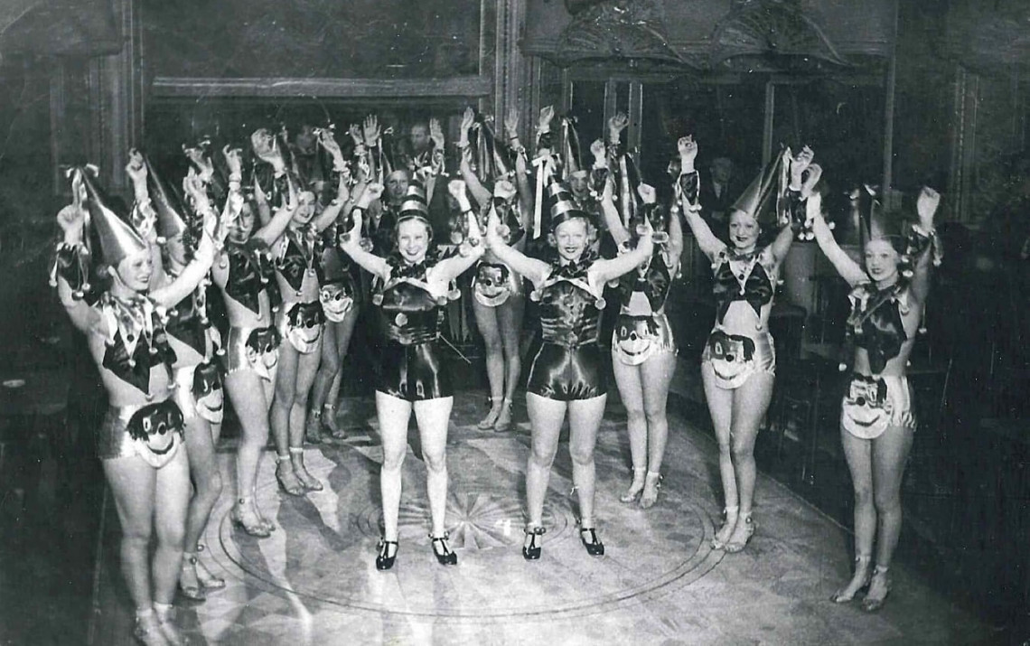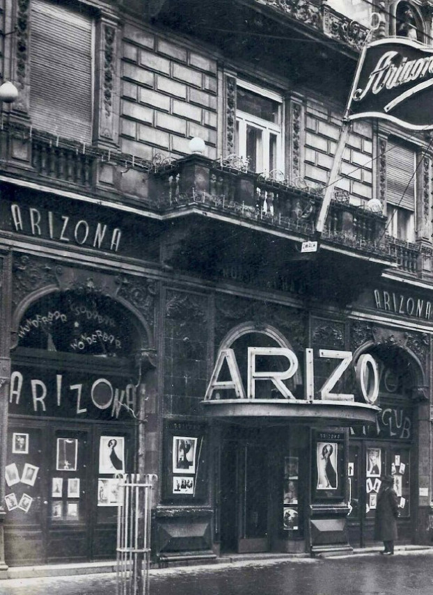 In 1932, after fifteen years touring the continent, musical parodist and conductor Sándor Rozsnyai and his wife, the acrobat and singer Mária Senger, bought the Mai Manó house located opposite the Moulin Rouge. They renamed the establishment the Arizona Dance Revue, with Senger – billed as Miss Arizona – as the star of the show. But it was not Senger’s artistry that was the main attraction. The show principally revolved around the chorus girls’ performances – who were sometimes hung upside down from the chandelier – and, above all, the technical innovations of the venue. The small dance floor functioned as a revolving stage, rising and falling, while the side boxes next to the stage descended at the press of a button – like elevators – into dark discretion. After one visit, the actor Gyula Csortos muttered that he felt like he was at the Ganz machinery works. Occasionally, animals also appeared in the shows, including a monkey, a fox, and Aida, a baby elephant which later gained renown for wielding a shaving razor as part of a circus act. When opening the nightclub, interior design was a major concern. Rozsnyai and Senger tried to postpone or avoid the emergency exits legally required by the fire department, as these would take away space for paying guests. The interior design, in addition to being functional, had to create a unique atmosphere that would also serve as a permanent backdrop for the shows.