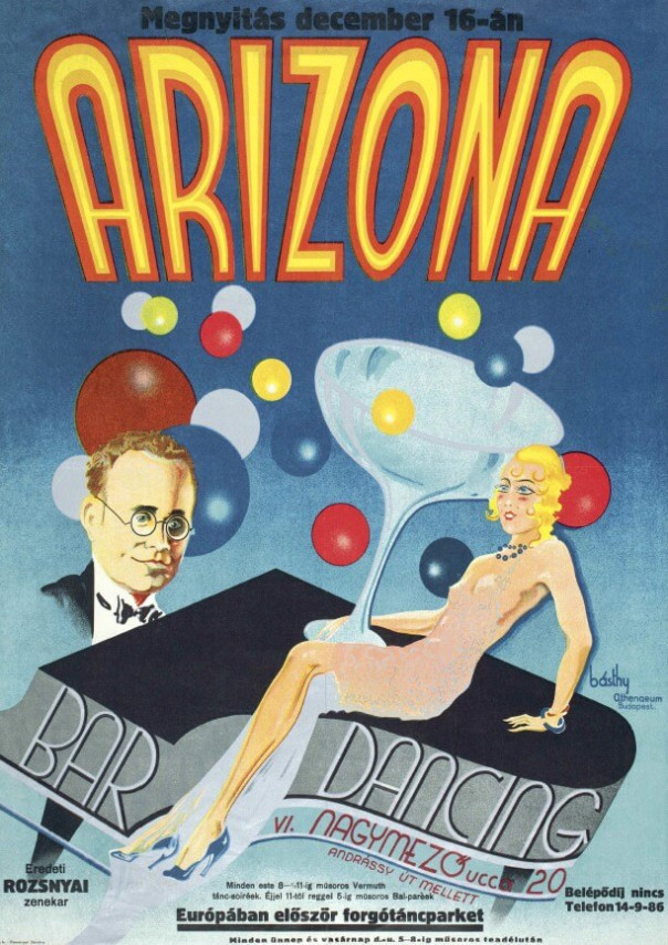 Although the Hungarian minister of trade Tihamér Fabinyi declared that Budapest should be “the city of entertainment” in addition to its baths, this did not mean that any official support was forthcoming beyond the inclusion of “Pesti (Budapest) Broadway” and its nightclubs in travel guides and tourist brochures issued by the Tourist Office. The city’s nightlife of the 1930s soon made its appearance in plays and pulp novels of varying quality – both Hungarian and English. It also made an early appearance in film: In the 1931 film Hyppolit Gyula Kabos ogles Mimi, played by Mici Erdélyi, from the confines of a private room of the Kolibri Bar during a performance of “Pá, kis aranyom, pá” (Bye, my darling, bye).