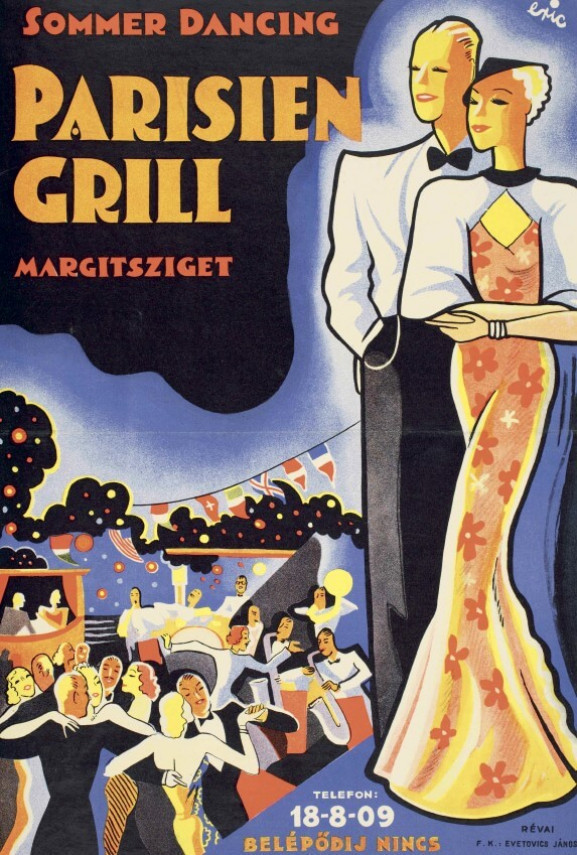 Eric Vogel’s poster for the opening of the Parisien Grill’s summer room, 1934. The restaurant and nightclub operated in the city from spring to autumn, with its open-air summer room built on the ruins of the old monastery on Margaret Island. Although there was no entrance fee, they didn’t allow in just anyone, and people were expected to imbibe. This proved no problem for its clientele, who could drink and dance away alcohol worth several times the average monthly salary in a single night.