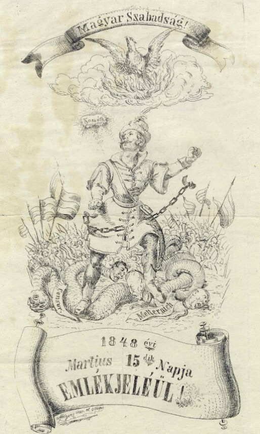 Who knows? Perhaps Petőfi’s talent as an actor, his instinct to become the “voice of the people,” and his deep awareness of the bond between himself and his readers all played a role in inspiring this great decision. Whatever the case, the following day, March 15, 1848, saw an exceptional unity of form and substance in a “performance” executed with flawless revolutionary artistry. The timing, the pacing, the spontaneously directed public action, all carried out with acuity, revealed both his poetic imagination and his undeniable political gift.