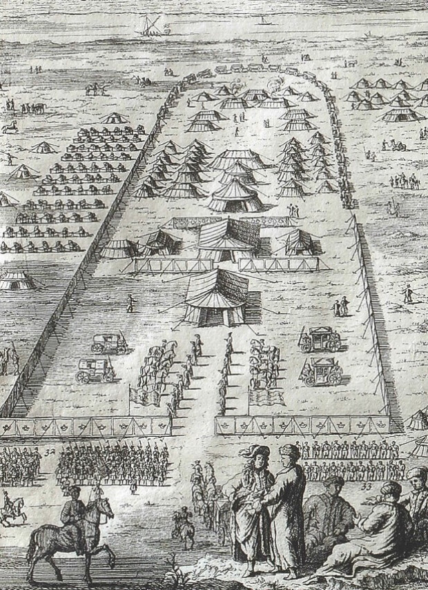 The envoys were permitted no more than one or two carriages when traveling from their camp to the venue for the talks, thus precluding their usual large entourage. Unauthorized movement between the camps was strictly forbidden, with permission granted only in exceptional cases. The Austrian and allied camp was guarded by some 2000 imperial infantry and a cavalry regiment, with sentries posted on the tops of the surrounding hills, along the river, and in the ruined town of Karlowitz. The mediators’ camp, in turn, was defended by 180 German cavalry and infantry, as well as 300 Turkish Janissaries and 200 cavalry. Lastly, the Turkish camp – located equidistance from the mediators’ camp as were the imperial forces – was protected by some 3000 troops on foot and on horseback. These troops were required for the safety and reassurance of both sides as their respective main forces were withdrawn.