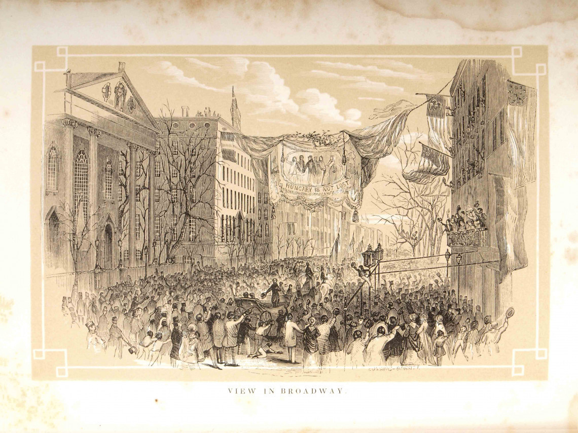 Kossuth’s triumphal procession on New York’s Broadway, on December 6, 1851. The former Hungarian leader left Southampton for America on November 20, 1851, to thank the American people for the help in obtaining his freedom. The Americans received Kossuth with respect almost befitting a sitting head of state. The banner in the picture reads “Hungary is not lost” and is a paraphrase of the opening line of the Polish national anthem Mazurek Dąbrowskiego, which states “Poland is not lost.” Lithograph by an unknown artist