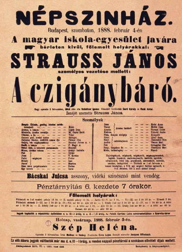 In light of all this, it is not surprising that Strauss’s work – as translated by Károly Gerő and Antal Radó – was also performed at Budapest’s Népszínház (Folk Theater) the year after its Viennese premiere. This was followed by a guest performance in 1888 with the composer himself conducting at the Népszínház.