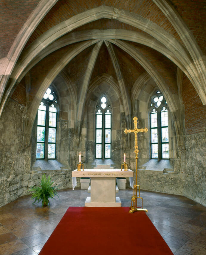 Néhány szerencsés esetben egy-egy kőfaragvány eredeti környezetében is fennmaradt, s ezekből, illetve az ezekkel rokon, leletként talált darabokból kiindulva, kiegészítve még nagyobb épületrészek is hitelesen rekonstruálhatók voltak. Ennek egyik legjobb példája a palota helyreállított gótikus terme. Itt a romos falakba foglalva, illetve a középső tartópilléreken in situ megmaradtak az egykori bordás boltozat egyes indítóelemei és az egyik ablak keretkövének részlete. A környező feltöltésben számos idetartozó boltozati borda és zárókő, valamint ablakkeret töredékére is rábukkantak. Ezek alapján együttesen jól kiszerkeszthető volt az egykori belső tér alaprajzi rendszere, a boltozat és az ablakok formája, kiosztása, s így hitelesen kiegészíthető volt az egyébként erősen csonkult épületmaradvány pincéje és az egykor fölötte álló terem.
